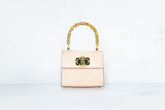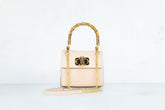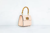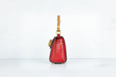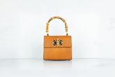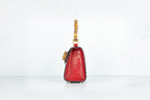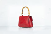 Prachtige handtas met bamboe handgreep. De tas wordt geleverd met een strap gemaakt van zowel rood leer als een gedeelte gouden chain, zodat deze ook crossbody of als schoudertas gedragen kan worden.