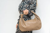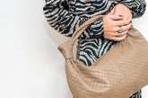 Handtas van gevlochten leer. Afsluitbaar met een rits.