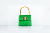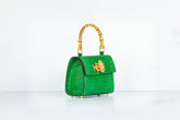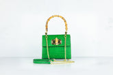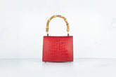 Prachtige handtas met bamboe handgreep. De tas wordt geleverd met een strap gemaakt van zowel rood leer als een gedeelte gouden chain, zodat deze ook crossbody of als schoudertas gedragen kan worden.