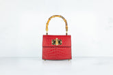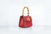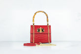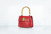 Prachtige handtas met bamboe handgreep. De tas wordt geleverd met een strap gemaakt van zowel rood leer als een gedeelte gouden chain, zodat deze ook crossbody of als schoudertas gedragen kan worden.