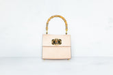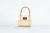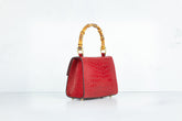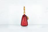 Prachtige handtas met bamboe handgreep. De tas wordt geleverd met een strap gemaakt van zowel rood leer als een gedeelte gouden chain, zodat deze ook crossbody of als schoudertas gedragen kan worden.